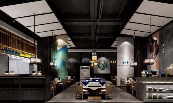 新鲜的理解,清爽的吃法,是火锅店的待客之道。业主不仅希望在饮食上满足客户的需求,也希望让客户在深层次的精神层面上感受到不同。新中式火锅店入口区域设计:在前台可以直观感受内部用餐环境。这里需要的是透明度